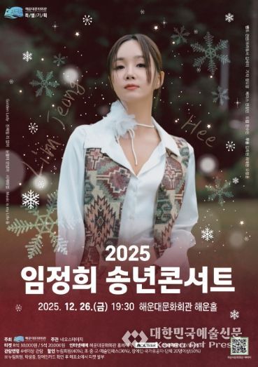 [대한민국예술신문] 해운대문화회관은 오는 12월 26일 오후 7시 30분, 해운대문화회관 해운홀에서 송년 특별기획 공연인 ‘2025 임정희 송년콘서트’를 개최한다.