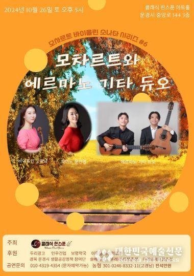 대한민국예술신문 관리자 기자 | 클래식 한스푼이 주최하는 기획공연 모차르트 바이올린 소나타 시리즈6 '모차르트와 에르마노 기타 듀오'가 오는 10월 26일 토요일 오후 5시 클래식한스푼 아트홀에서 펼쳐진다. (문경시 중앙로 144, 3층 소재)