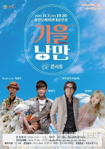 대한민국예술신문 관리자 기자 | 청양군은 가을의 정취를 가득 담은'가을 낭만 콘서트'를 오는 11월7일 청양문예회관에서 저녁 7시30분에 개최한다고 밝혔다.