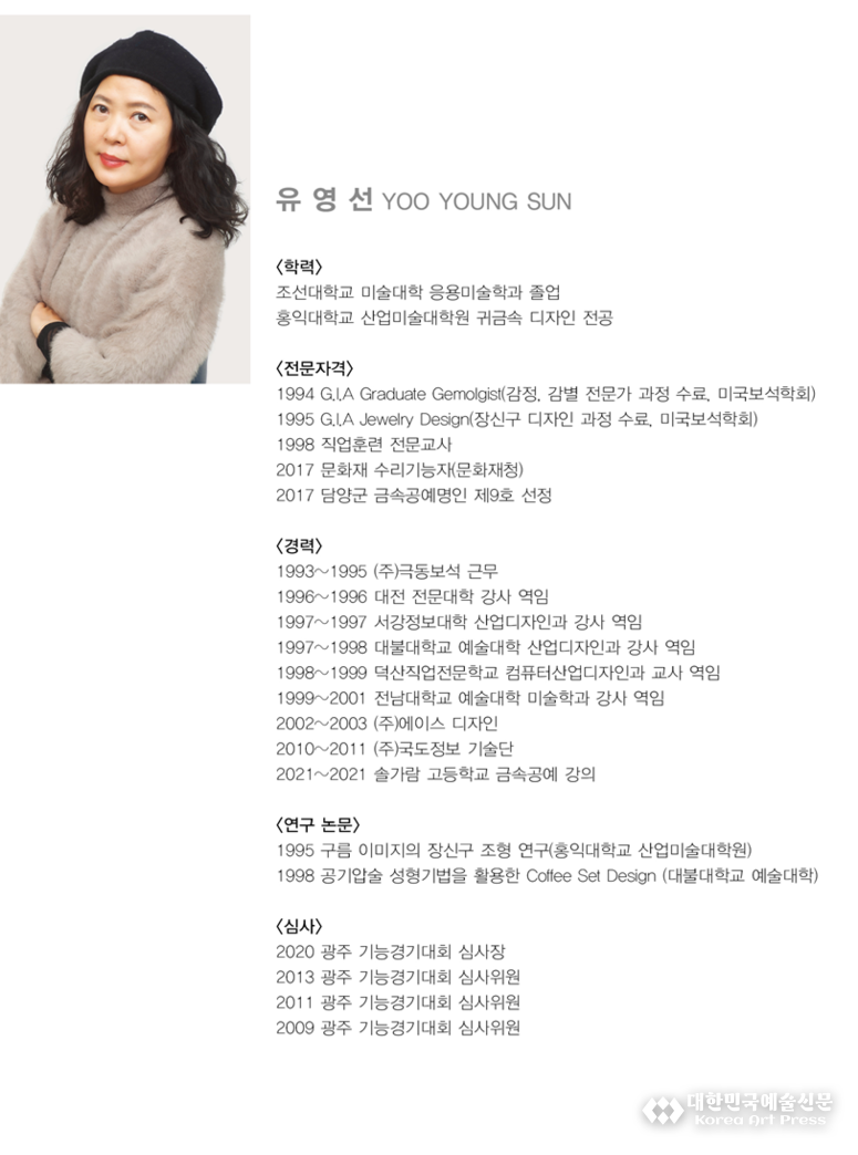 누구보다 뜨거운 열정으로 차가운 금속을 다독이며 일상의 예술을 실천하고 있는 유영선 명인. 공방 이름처럼 세상에 따뜻한 햇살을 ‘해드리고’ 싶다는 그의 삶과 예술 철학을 10가지 질문에 담았다.