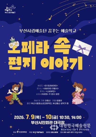 [대한민국예술신문] 부산시립예술단에서는 특별기획 ‘오페라 속 편지 이야기’에 출연할 솔리스트들을 모집한다. 이번 오페라 무대를 통해 자신만의 실력과 끼를 방출할 부산지역의 청년 예술인들을 선발할 예정이다.