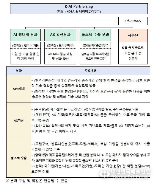 K-AI Partnership 공동의장은 KOSA 조준희 협회장과 네이버클라우드 김유원 대표가 맡았으며, ▲AI 생태계 경쟁력 강화 ▲AX 확산 ▲AI 풀스택 수출을 위한 3개 분과를 운영한다.