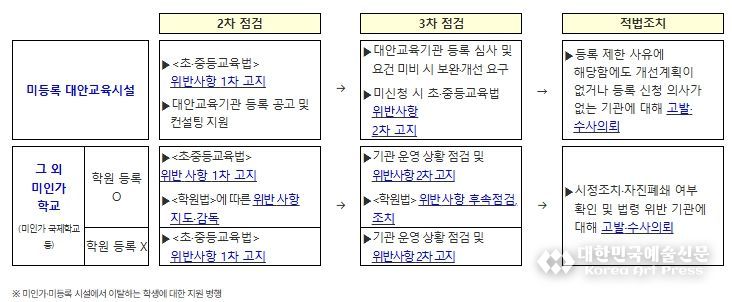 아울러, 교육부와 시도교육청은 이번 조치로 기관이 폐쇄되거나, 미인가·미등록 시설임을 인지하여 시설에서 이탈하는 학생·학부모에 대한 지원도 한층 더 강화한다.