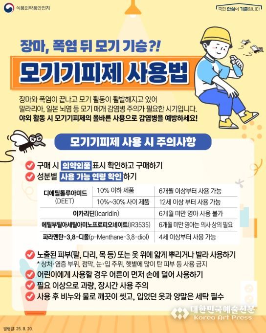 대한민국예술신문 관리자 기자 | 식품의약품안전처는 ‘세계 모기의 날’을 맞이하여 여름철 다소비 제품인 의약외품 ‘모기 기피제’의 올바른 사용법, 주의사항 등 안전 사용 정보를 안내한다고 밝혔다.