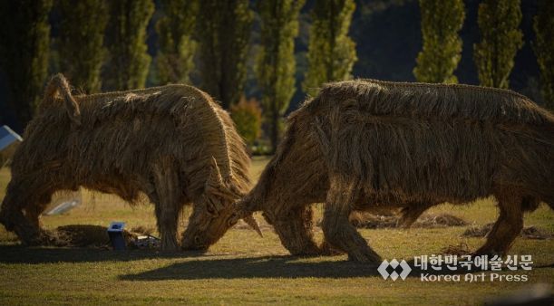 [대한민국예술신문] 아름다운강천 사회적협동조합은 경기문화재단의 지원을 받아 ‘지붕 없는 박물관’ 사업의 일환으로 2025년 강천섬에 짚으로 만든 황소 조형물 두 건을 설치했다. 이번 작품은 소싸움을 연상시키는 역동적인 구도로 제작되어, 자연 속에서 생동감 넘치는 예술적 장면을 연출했다.