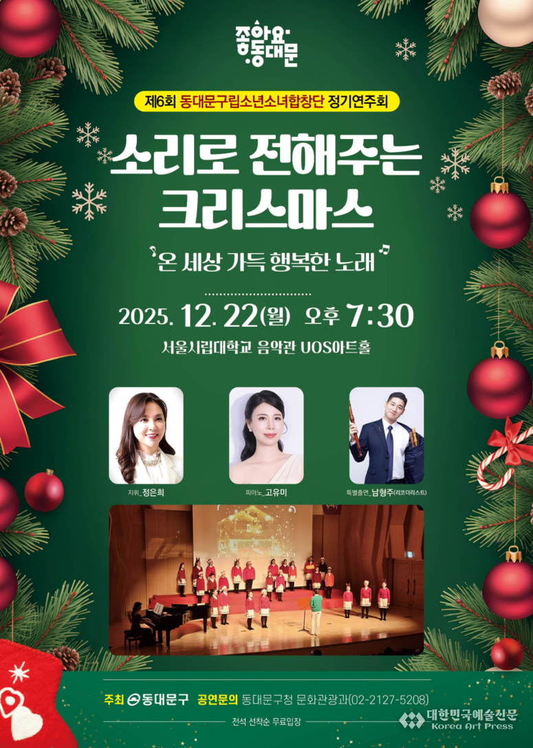지휘자 및 성악가 정은희, 피아니스트 고유미, 성악가 김현진•최승주•남은채로 구성되어 있는 동대문구립소년소녀합창단은 12월 22일 월요일 오후 7시 30분에 서울 시립대학교 음악관 UOS아트홀에서 연주회를 하게된다.