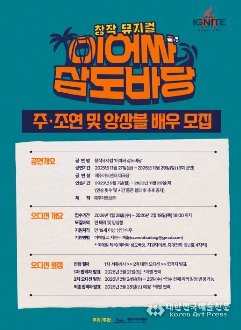 [대한민국예술신문] 제주아트센터는 올해 11월 개최 예정인 창작뮤지컬 ‘이어싸 삼도바당’에 참여할 배우를 모집하고, 공연 오디션을 진행한다.