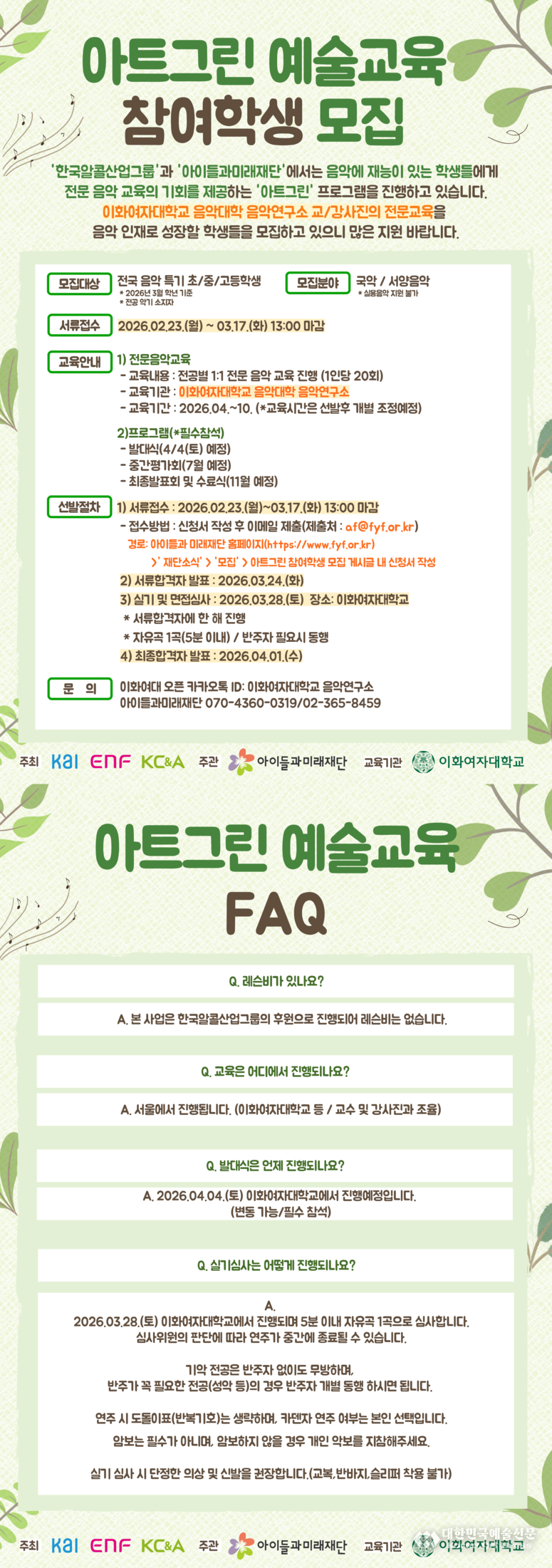 한국알콜그룹 후원으로 아이들과미래재단과 이화여대 음악연구소가 운영하는 아트그린 예술교육 프로그램에서 음악 인재로 성장할 학생들을 모집하고 있습니다. 선발된 학생들에게는 이화여자대학교 음악대학 음악연구소 교/강사진의 1:1 전문 음악교육 기회가 주어지며, 무대 경험을 쌓을 수 있는 다양한 연주 혜택도 누리게 됩니다. 모집 대상자는 음악에 특기를 가지고 있는 전국의 모든 중, 고등학생입니다.