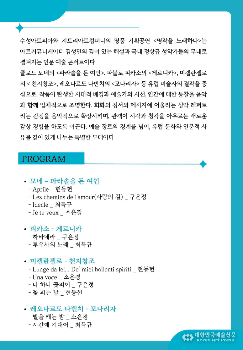 이러한 미술 해설과 함께, 작품의 정서와 메시지에 맞춰 선별된 음악이 국내 정상급 성악가들의 목소리로 연주된다. 성악의 풍부한 표현력은 회화가 담고 있는 감정과 서사를 음악적으로 확장시키며, 관객이 시각과 청각을 동시에 통해 작품을 경험하도록 이끈다. 음악과 미술, 해설이 서로를 보완하며 하나의 흐름으로 이어지는 구조는 관객에게 새로운 감상의 방식을 제시한다.