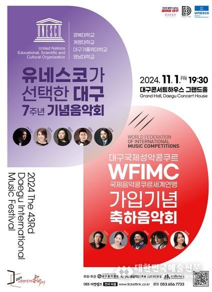 대한민국예술신문 관리자 기자 | 대구광역시는 대구국제성악콩쿠르의 국제음악콩쿠르 세계연맹(WFIMC) 가입을 축하하고, 유네스코 음악창의도시 대구 지정 7주년을 기념하는 음악회를 11월 1일 오후 7시 30분 대구콘서트하우스 그랜드홀에서 개최한다.